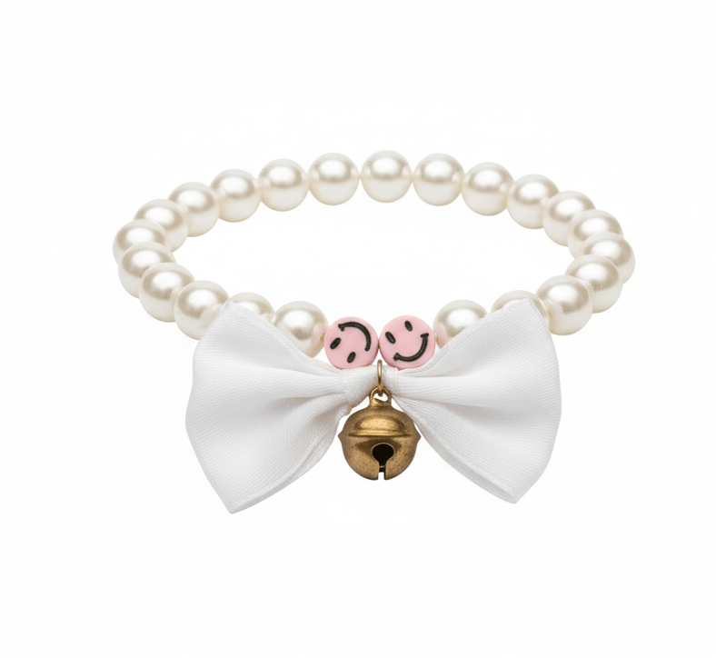 Cat Pearl Collar | Pet Collar | White Bow Design With Bell & Smiley Charm