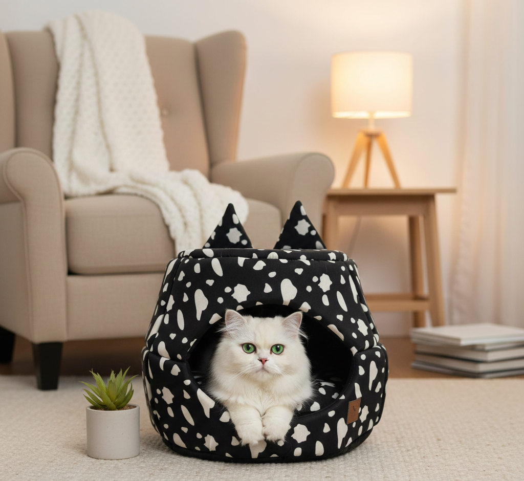 - Two solid colours combine in a suitable way, sculpting a simple and stylish appearance, which will be one of your great family view. The velvety material of this cat house provides excellent insulation and is soft to the touch, making this an ideal bed for lounging cats.
