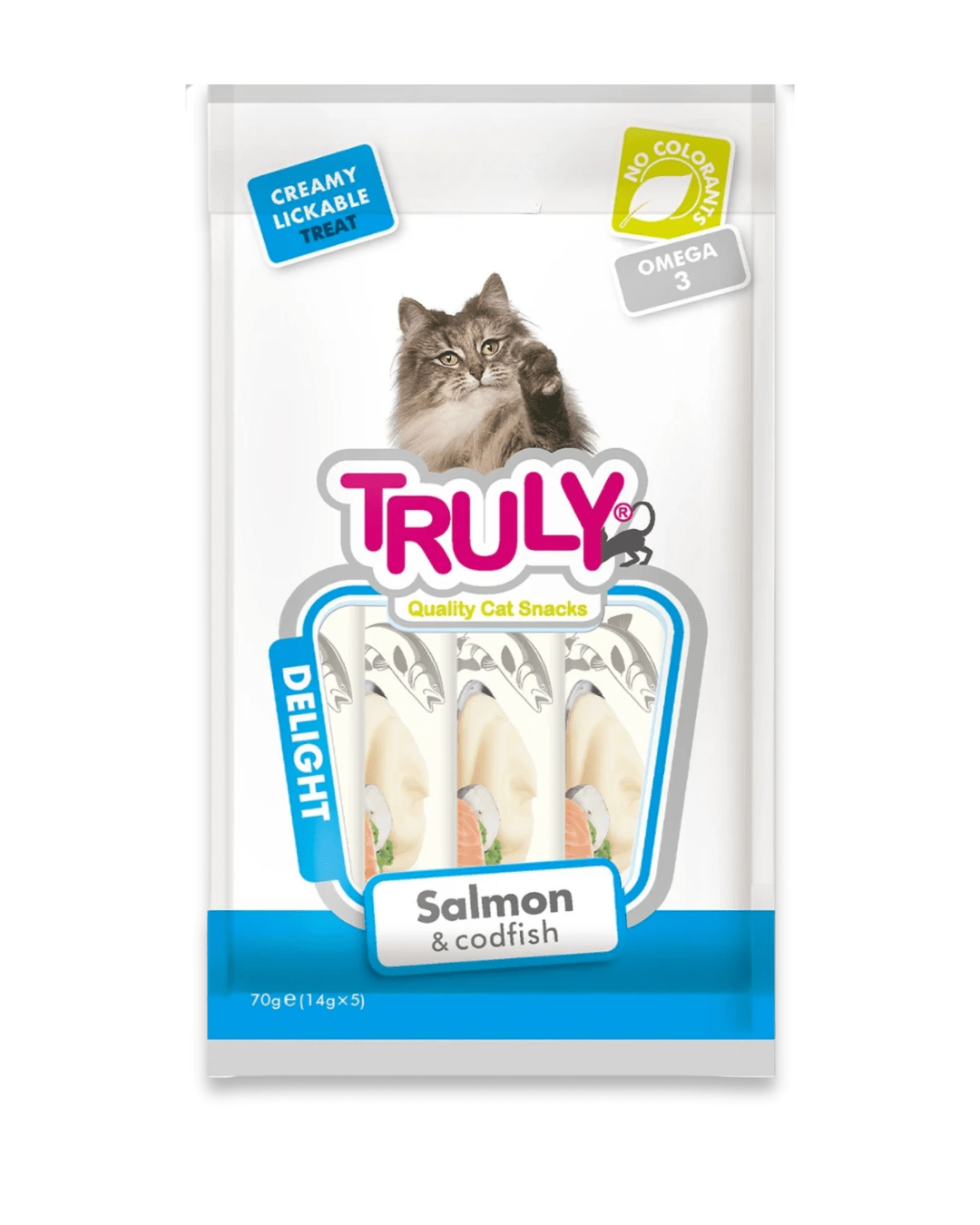Truly Salmon & Codfish Creamy Lickable Treats are a delicious and functional snack designed to delight your cat’s taste buds while supporting their well-being. Made with real salmon, codfish, and chicken, these treats are rich in natural Omega-3 fatty acids for skin and coat health, and fortified with taurine to promote optimal heart and eye function.